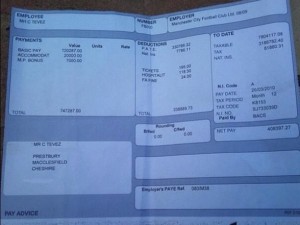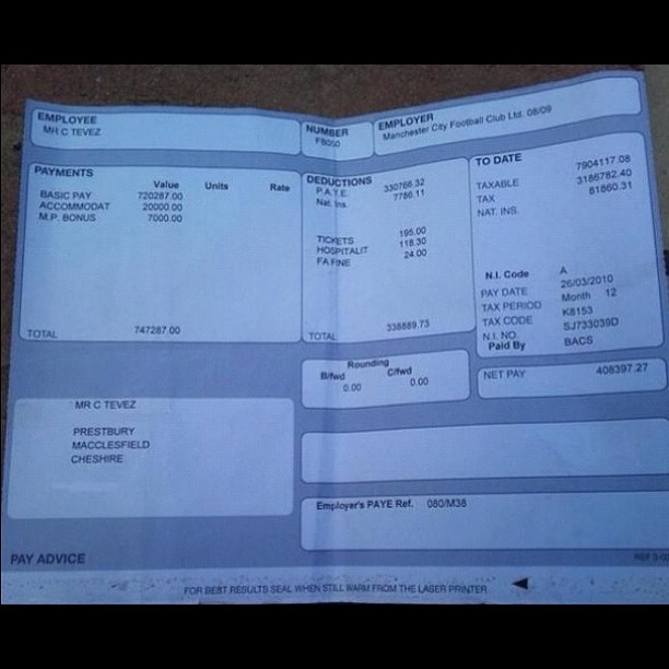 Una busta paga sta facendo impazzire Twitter. L’immagine che documenta lo stipendio incassato a marzo del 2010 da Carlitos Tevez, è diventata in poco tempo uno dei tormentoni del social network. Un utente infatti ha pubblicato una foto della presunta busta paga dell’attaccante argentino del Manchester City. Il pirotecnico centravanti sudamericano è uno dei calciatori più pagati del club inglese e dell’intera Premier League. Secondo il documento, il netto percepito da Tevez sarebbe di 500mila euro. Cifre che subito hanno scatenato i commenti degli utenti del social network che hanno ironizzato confrontando la loro retribuzione annuale con quella della stella della squadra di Mancini. Più che lecito ipotizzare che si possa trattare anche di un fake creato ad hoc per guadagnare visibilità su Twitter. Nel frattempo però l’immagine sta a poco a poco conquistando il web e dividendo il popolo degli internauti. Chissà se in futuro saranno pubblicate altre foto relative agli stipendi percepiti da altri calciatori. Magari quelli di giocatori del campionato di calcio di Serie A.