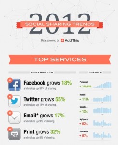 I dati, raccolti in un’infografica pubblicata su Search Engine Journal e realizzata da AddThis, mostra i social sharing trends del 2012. Come detto, tra i principali servizi utilizzati spiccano Facebook, Twitter e la posta elettronica.